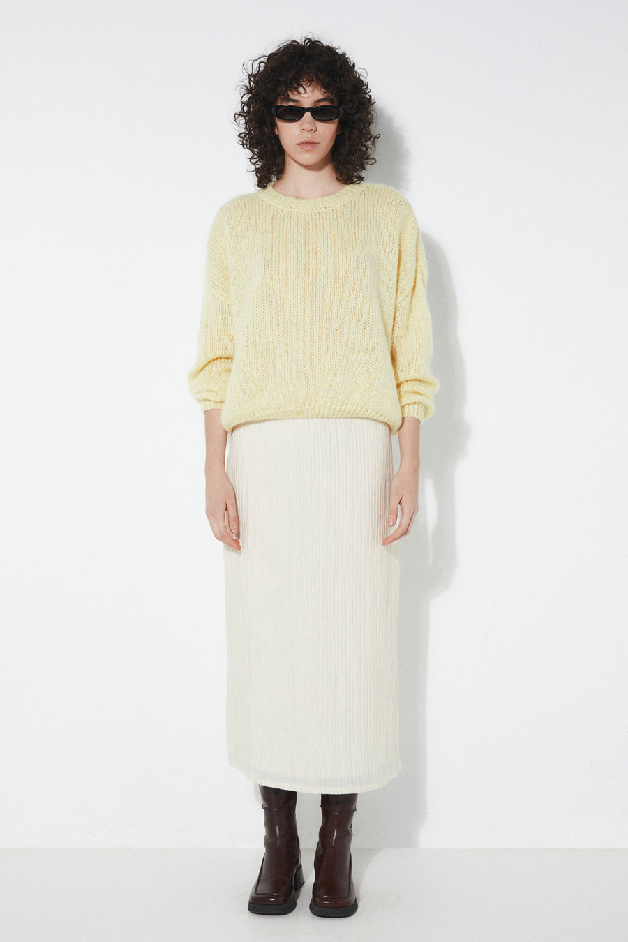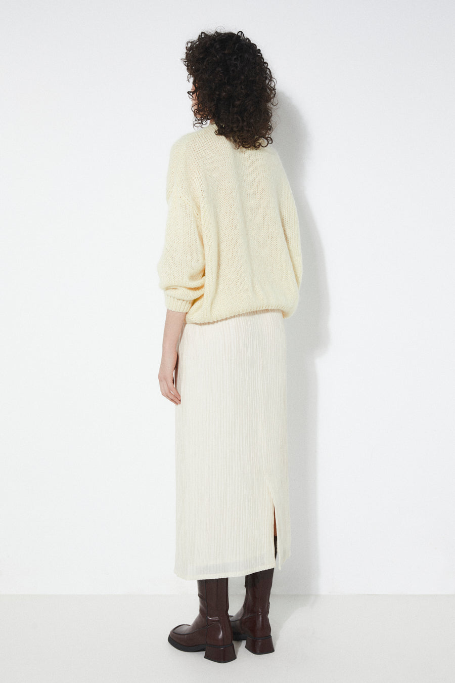 - afhangende schoudernaden met geribbelde boorden aan de kraag, manchetten en zoom